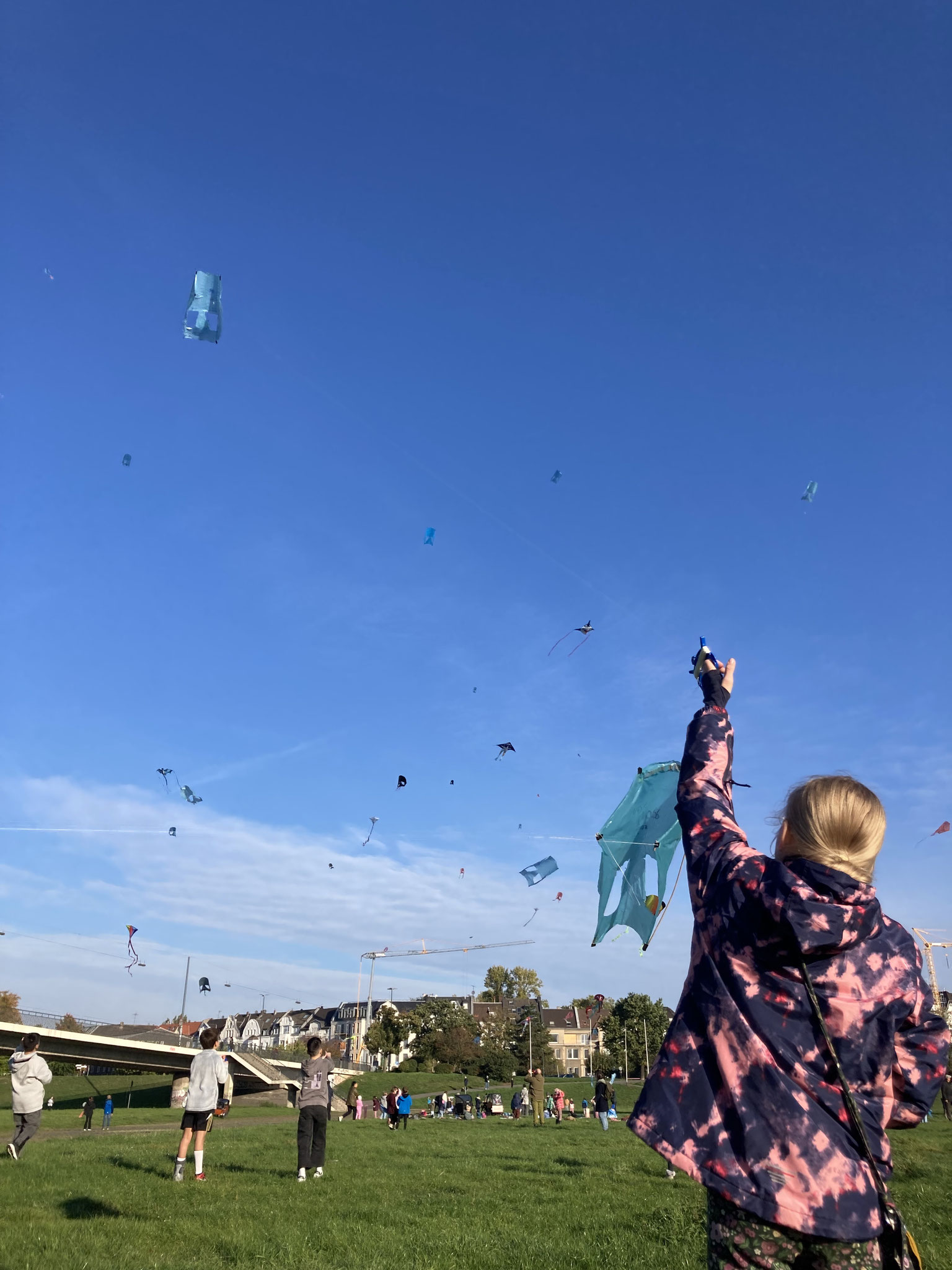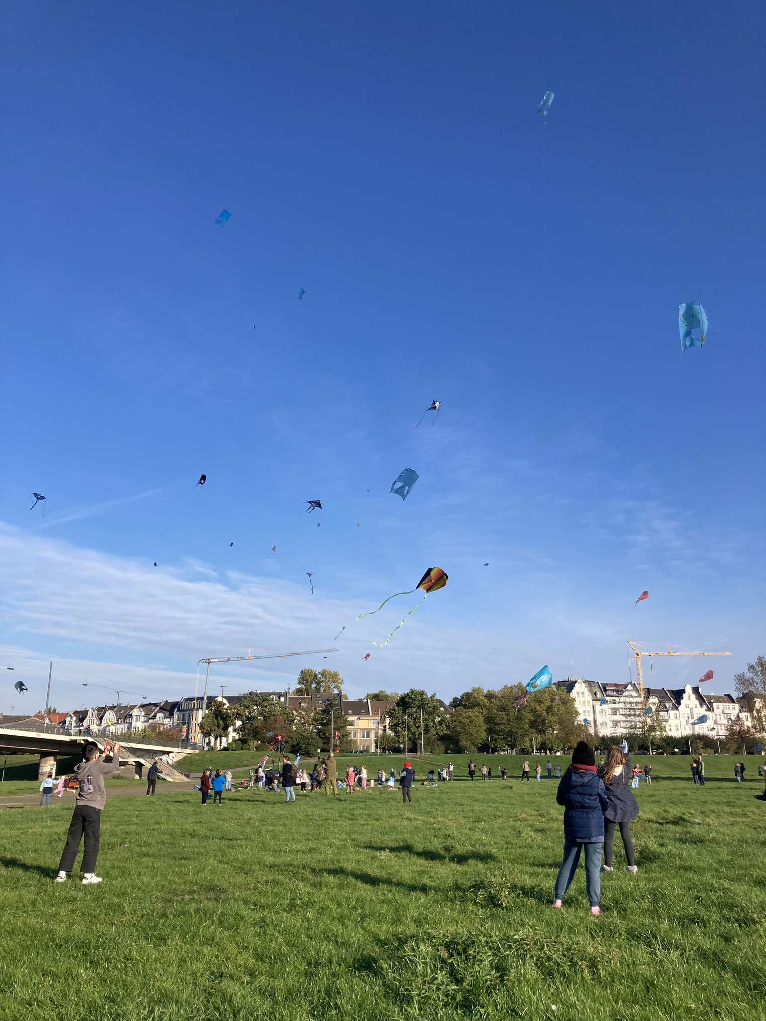 Anfang Oktober war es wieder soweit: Auf den Oberkasseler Rheinwiesen haben die Kinder, Lehrkräfte und einige Eltern der Schule unser alljährliches Drachenfest gefeiert und die selbst gebastelten Drachen steigen lassen. Bei strahlendem Sonnenschein und frischem Wind flogen die Drachen dieses Jahr besonders gut.